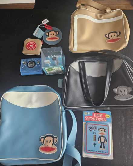 includes 3 bags, 1 ornament, light switch plate, watch, wallet and coin purse.