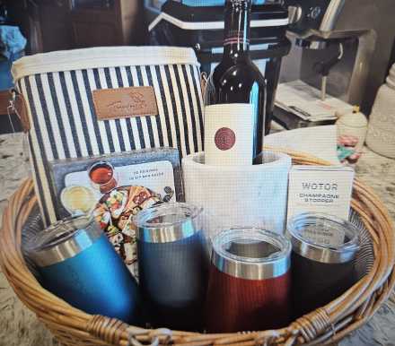 Bottle of Canyon Road Cabernet Sauvignon, wine tote, wine and cheese pairing book, marble wine chiller, champagne stopper and 4 insulated wine cups with lids.