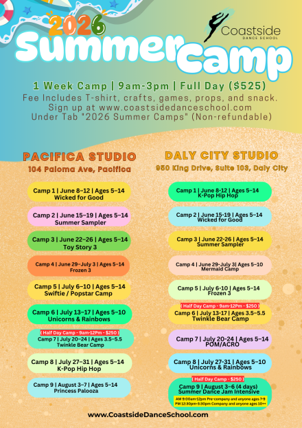 Give the gift of movement and creativity! This certificate is good for one week of Coastside Dance’s 2026 Summer Camp, where dancers of all levels can explore a variety of dance styles, build confidence, and enjoy a fun, engaging camp experience. Choose from any available week—see the camp flyer for options. Perfect for young dancers looking to grow their skills and make unforgettable memories.
