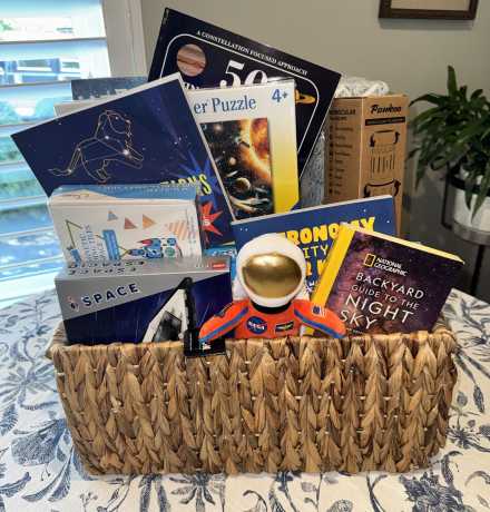 Blast off into a world of imagination with this intergalactic-themed gift basket, generously created by our 1st grade class! Packed with space-inspired toys, books, and cozy essentials, this bundle is perfect for curious kids who dream of stars, planets, and beyond.