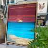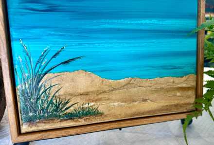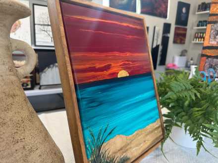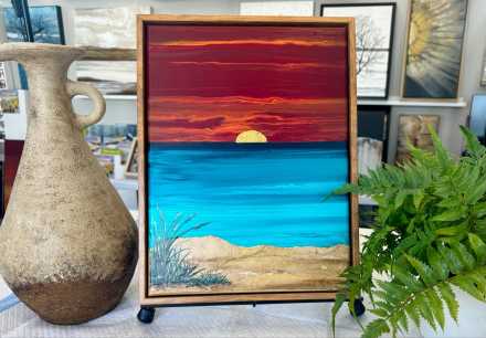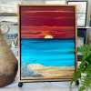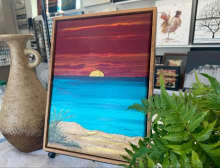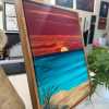 12x16 Gallery Wrapped Canvas, Framed with hanging hardware, embellished with textured Mulberry Paper and some brush work. Finished with one coat of gloss varnish and two coats of satin varnish. Technique was flip cup and swipe.