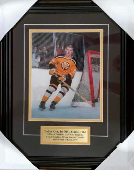 Bobby Orr 1st NHL Game (wearing # 27) numbered & limited edition photo, high quality custom framed & matted with brass plaque to an over-all size of 18” x 23”.