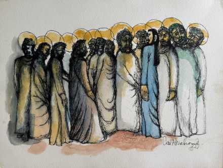 Watercolour, 16x12 - This powerful and moving watercolour painting by Carl Abrahams depicts thirteen Israelites. Its dramatic composition and expressive brushstrokes convey the strength and resilience of the human spirit, while its subtle details and nuanced colors invite closer inspection. A profound and inspiring work of art.