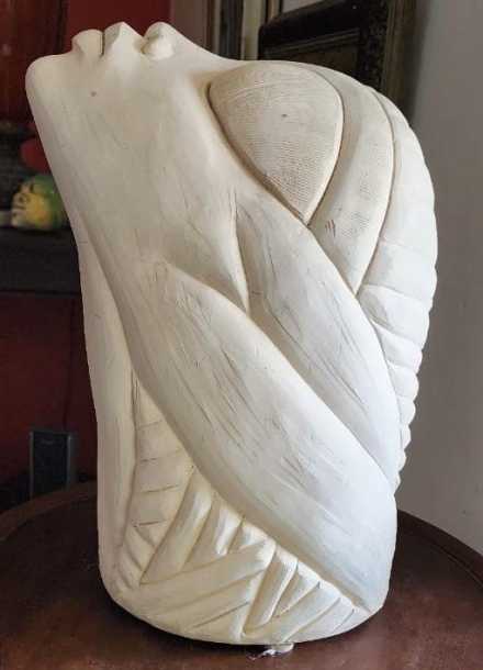 Ceramic, White Terracotta, 13 inches tall - This elegant and minimalist ceramic sculpture by Gene Pearson is a study in purity and form. Its smooth, flowing curves and pristine white surface create a sense of serenity and tranquility, while its subtle details and nuanced composition invite closer inspection. A beautiful and timeless work of art.