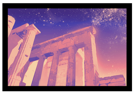 This artwork is a digital reinterpretation of a real-life image, capturing the timeless essence of Athens, where cosmic light washes over its iconic ancient ruins.
