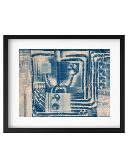 Walk around the school and look up. This textile work is a cyanotype depicting a collage made in a simple computer paint program from 2004, it was made from 5 pictures of the schools industrial ceilings put together to make one big image. The image was then printed onto A3 tracing paper and put over textile coated in ferric ammonium citrate and potassium ferricyanide. It was left in uv light for an hour. Remaining textile cyanotype parts were then sewn together onto the work.