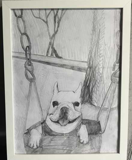 The drawing depicts a popular dog that has become a meme on the internet alluding to how we form emotional bonds and para-social connections to thinks we have no physical experience of.