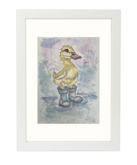 A charming and humorous watercolor featuring a determined little duckling standing proudly in a pair of oversized blue boots. Soft washes of blues, purples, and yellows create a gentle, dreamy atmosphere, while Thailys’s signature squiggly-line technique brings the duckling to life with movement and personality. The playful stance and expressive textures give this piece a heartwarming sense of courage and individuality.