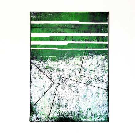 This painting translates architectural ideas into a calm, abstract composition. Soft green and white tones evoke natural surroundings - plants, trees and the environment we live in. Black and white geometric shapes suggest sketches, blueprints and structural elements. Layers and textures create depth, light and movement that is shaping the space. The work explores how structure and surroundings influence emotion and perception. It reflects the connection between architecture, environment and human experience. The painting encourages reflection on how the spaces around us guide our imagination and our understanding of the world.