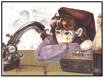 This mixed-media artwork presents a contemplative scene, centering on a stylized character leaning thoughtfully across a counter. Rich, expressive shading and warm tones give the figure a cinematic depth, while the bold graphic shapes of their face-highlighted by a star-shaped mark-add a striking, illustrative flair. Everyday objects in the foreground, including a gleaming faucet, a vintage box, and a glass bottle, create a sense of stillness and intimacy, contrasting with the loosely sketched architectural backdrop. The result is a piece that feels both personal and narrative-driven, capturing a quiet moment suspended between observation and imagination.