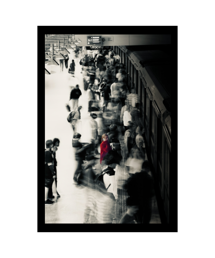 This photograph explores how individuality becomes blurred within the pace of a large city, where crowds move quickly and independently through shared space. In the metropolis, people coexist yet rarely connect, each absorbed in their own urgency and destination. Against this backdrop of motion and anonymity, the image captures a rare moment of recognition: a brief exchange of eye contact between two strangers. This fleeting connection interrupts the urban rush, revealing the fragile tension between isolation and human presence. It reminds us that even within the overwhelming rhythm of city life, a single glance can cut through the noise and affirm our shared humanity. The photograph was taken in a Warsaw metro station.