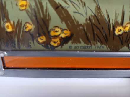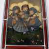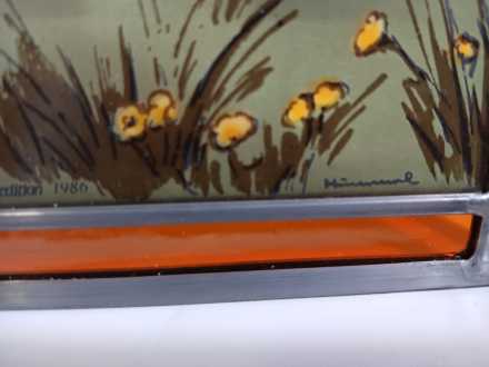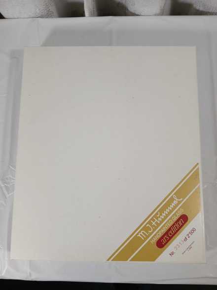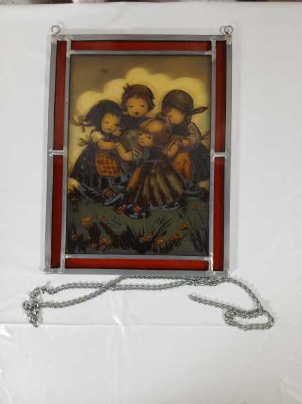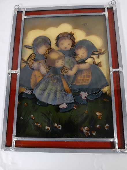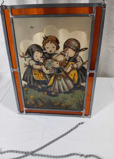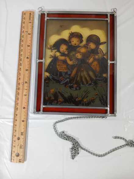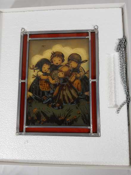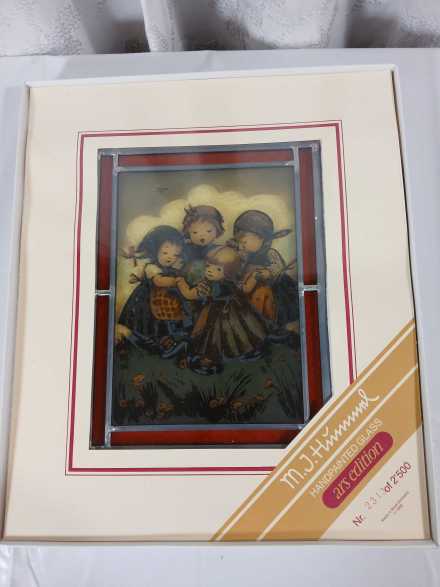 1986 M.J. Hummel suncatcher with hand painted glass, painted on both sides of the glass for depth. Measures approx. 6-1/2" x 8-1/2". New in original box. Numbered 2313 of 2500.
