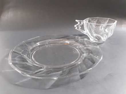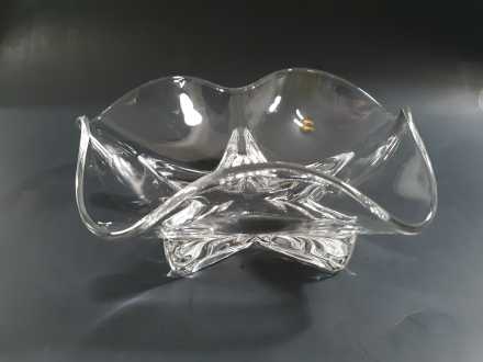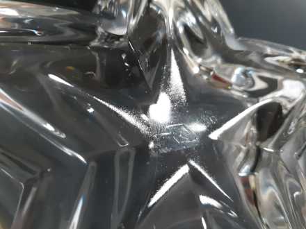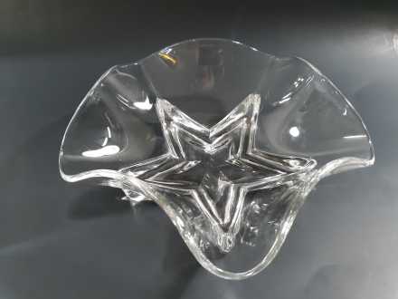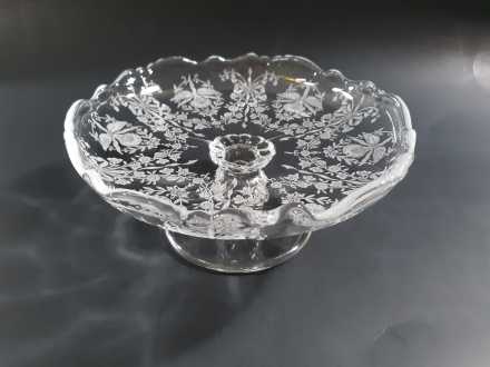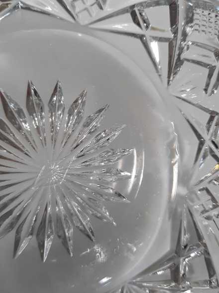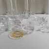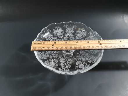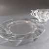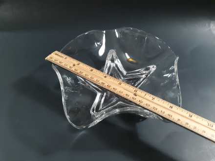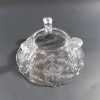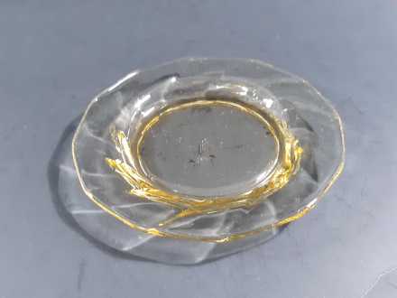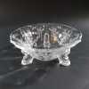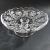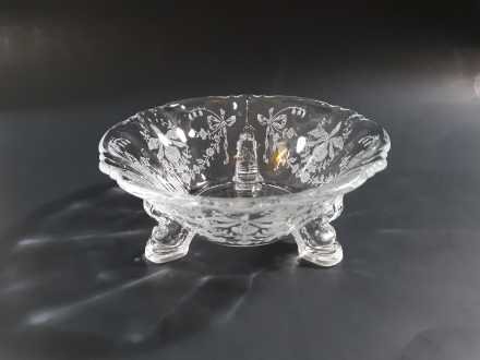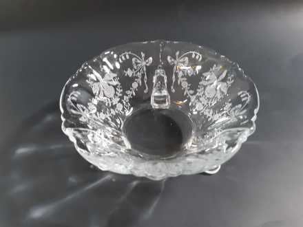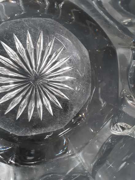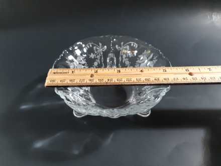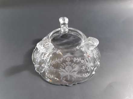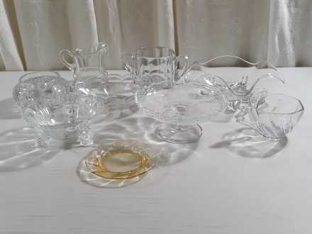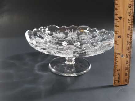 Heisey Orchid pattern 6-1/2" compote. Heisey Orchid pattern three footed dish, rough edges on the feet might be flea bite chips or part of manufacture. Heisey punch cup with swirl pattern and zig zag lightning bolt handle, possibly Heisey crystolite, and 8" plate. Heisey dresser jar, no lid. Heisey pitcher. Heisey sugar bowl. Heisey star shaped dish. Heisey oval dish. Heisey yellow glass 4-1/4" plate. Heisey