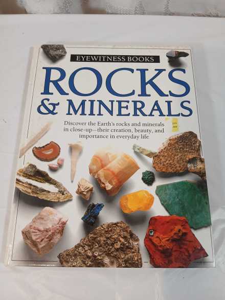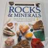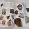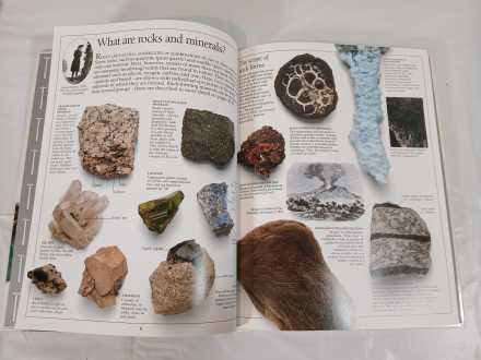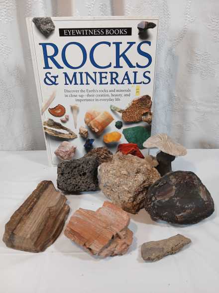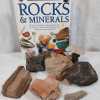 Assorted rocks, petrified wood, mushroom coral and "Rocks & Minerals" reference book.
