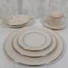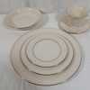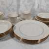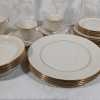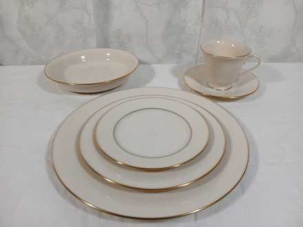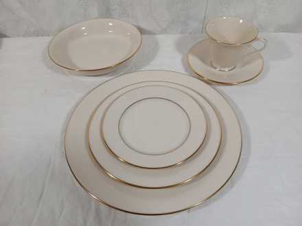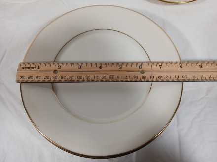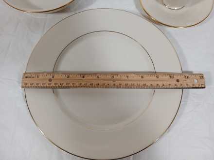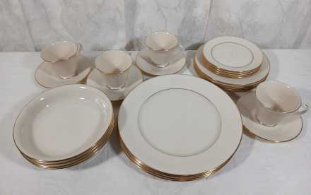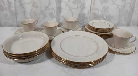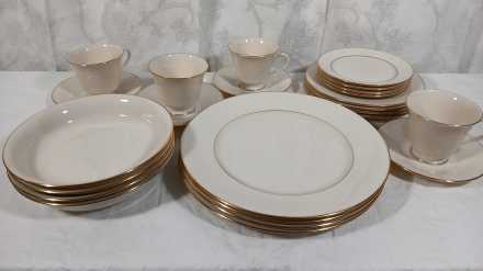 (4) Lenox "Hayworth" 6-piece place settings. (4) 10-3/4" dinner plates (4) 8-1/4" salad plates (4) 6-1/4" dessert plates (4) 7-3/4" soup bowls (4) cups (4) saucers. All are in new condition. I don't believe they were ever used.