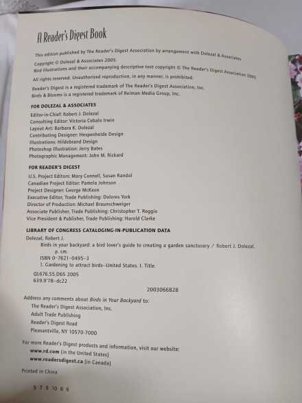 John James Audubon "The Birds of America", copyright 1985. This is a reprinting of the volume published in 1937, with 435 plates originally published by Audubon between 1827 and 1838. Reader's Digest "Birds in Your Backyard", a Bird Lover's guide to creating a Garden Sanctuary.