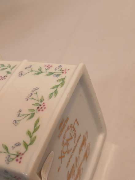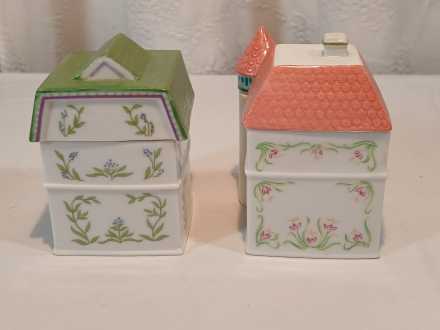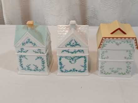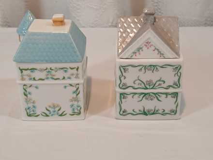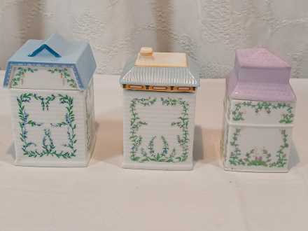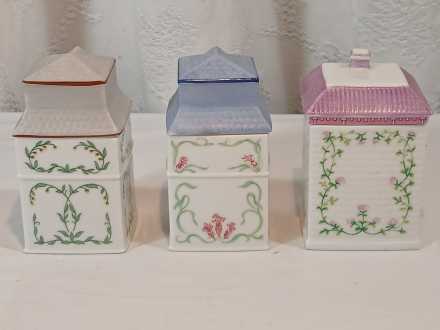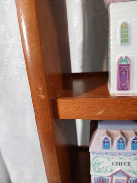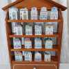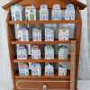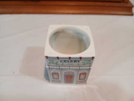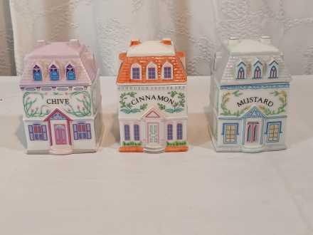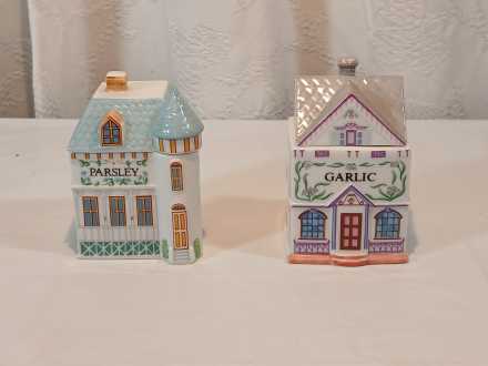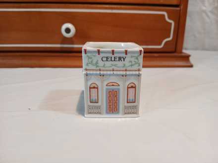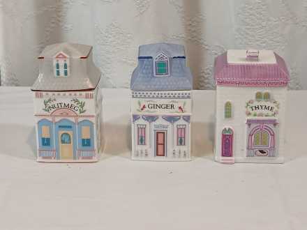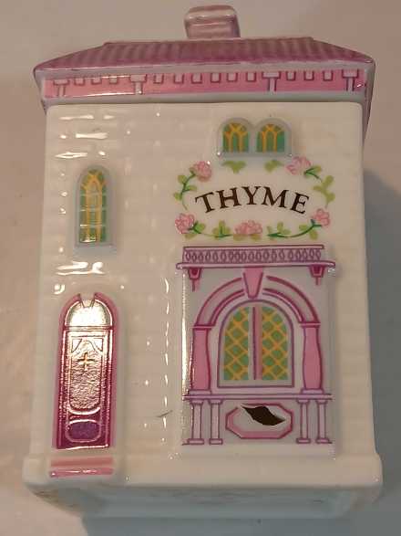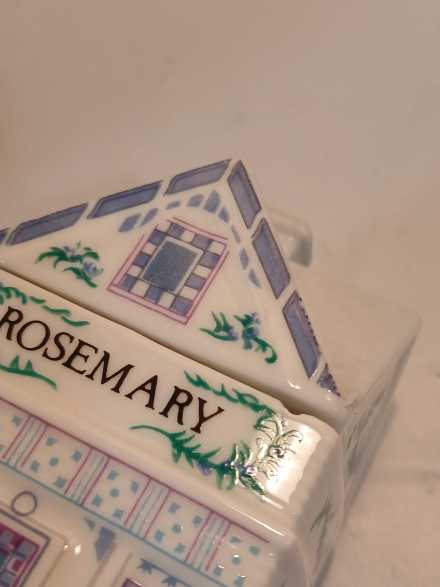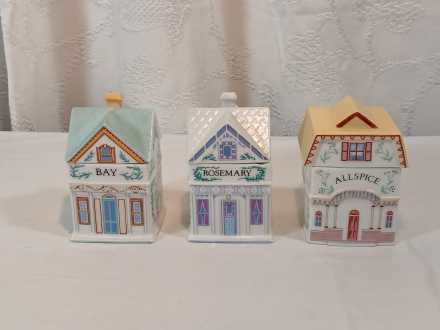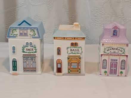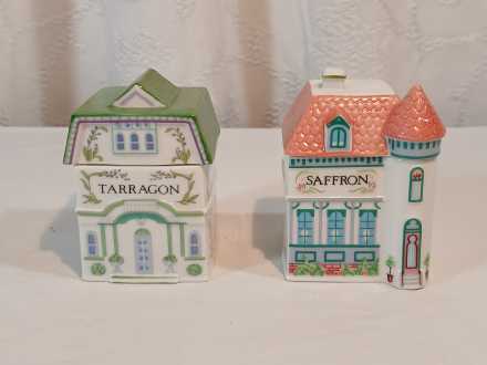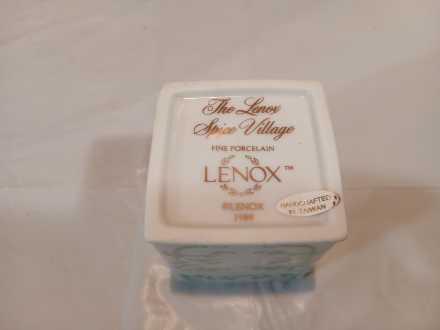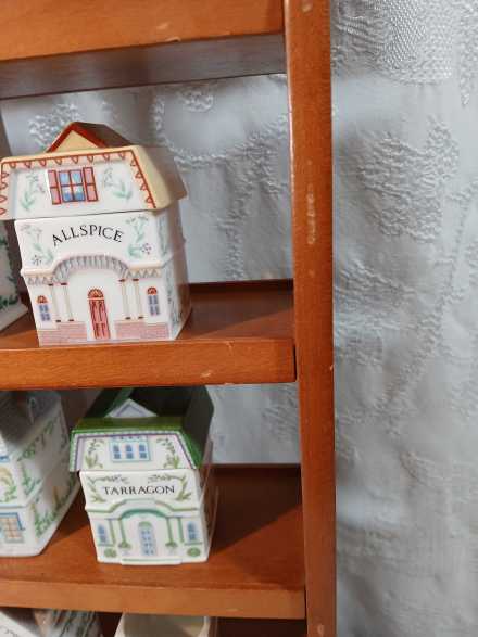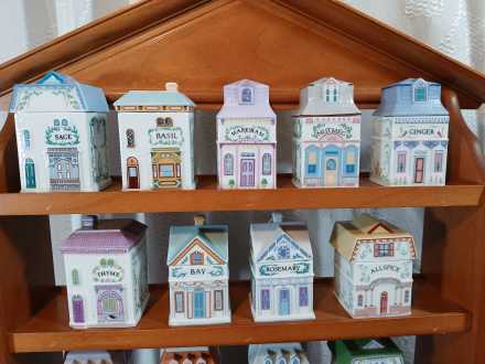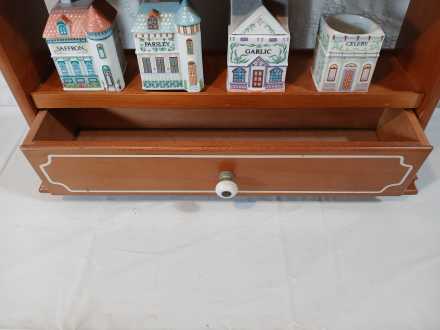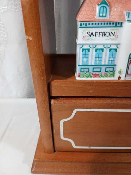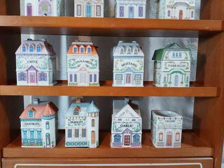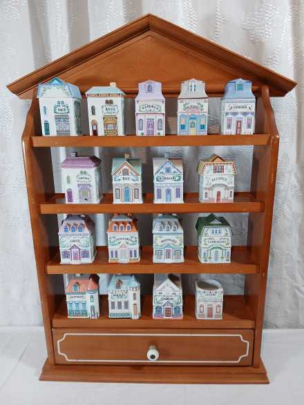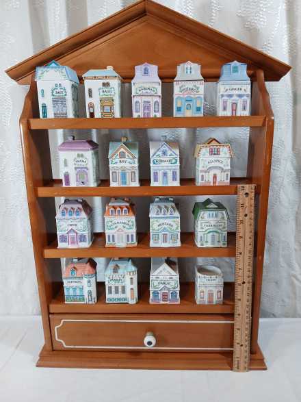 1989 The Lenox Spice Village partial set with (17) houses and wooden display rack. Houses include Sage, Basil, Marjoram Nutmeg, Ginger, Thyme (damaged), Bay (chipped), Rosemary (chipped), Allspice (fleabite chip on base, may be manufacturing defect), Chive, Cinnamon, Mustard, Tarragon, Saffron, Parsley and Garlic. Celery house without lid. Rack measures 17-1/2" x 23-3/4". Rack has a few minor scuffs.