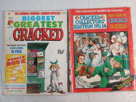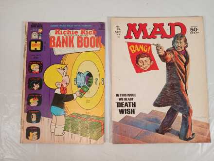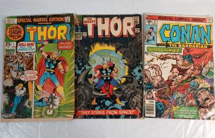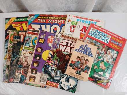 1977 Star Wars comic book. 1979 Star Trek Catalog. 1970's "Cracked" magazines, in moderate condition. 1975 Mad magazine, moderate condition. 1974 Richie Rich Bank Book comic, moderate condition. 1966 Thor, 1971 Thor(cover off), 1976 Conan comic books, all with some damage. 1974 & 1976 large format Thor comic books, moderate condition.