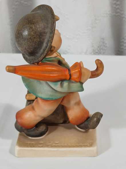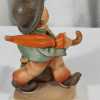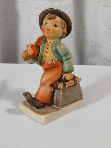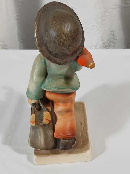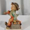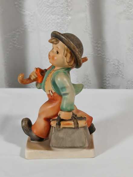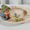 Vintage Hummel "Chick Girl" lidded dish. Vintage Hummel Boy with Bird ashtray, some crazing. "Merry Wanderer" figurine, W. Germany