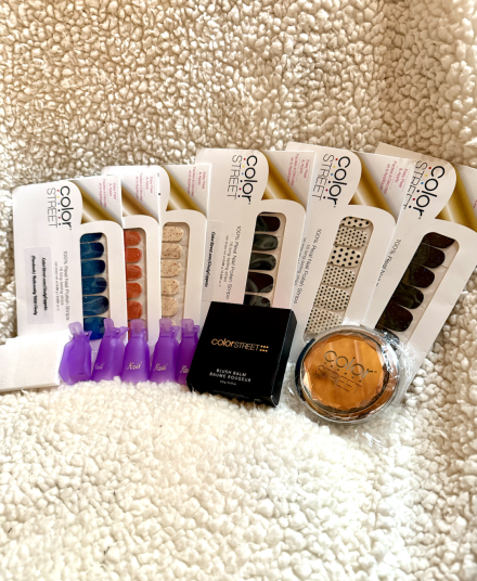 This bundle includes 6 sets of Color Street press-on nail strips, fingernail holders, wipes, blush, and a compact mirror. Perfect for a day of fun at home! All materials were generously donated by Nailcessity with Cindy (find her on Facebook).