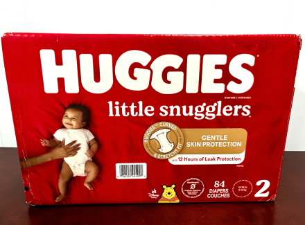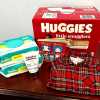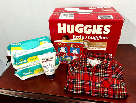This bundle includes Huggies Size 2 diapers 84ct, 2 packs of Pampers Sensitive wipes, Aquaphor, a Christmas book, and a "Little Me" holiday themed sleeper 3-6mo. It's the perfect gift for the little one in your life!