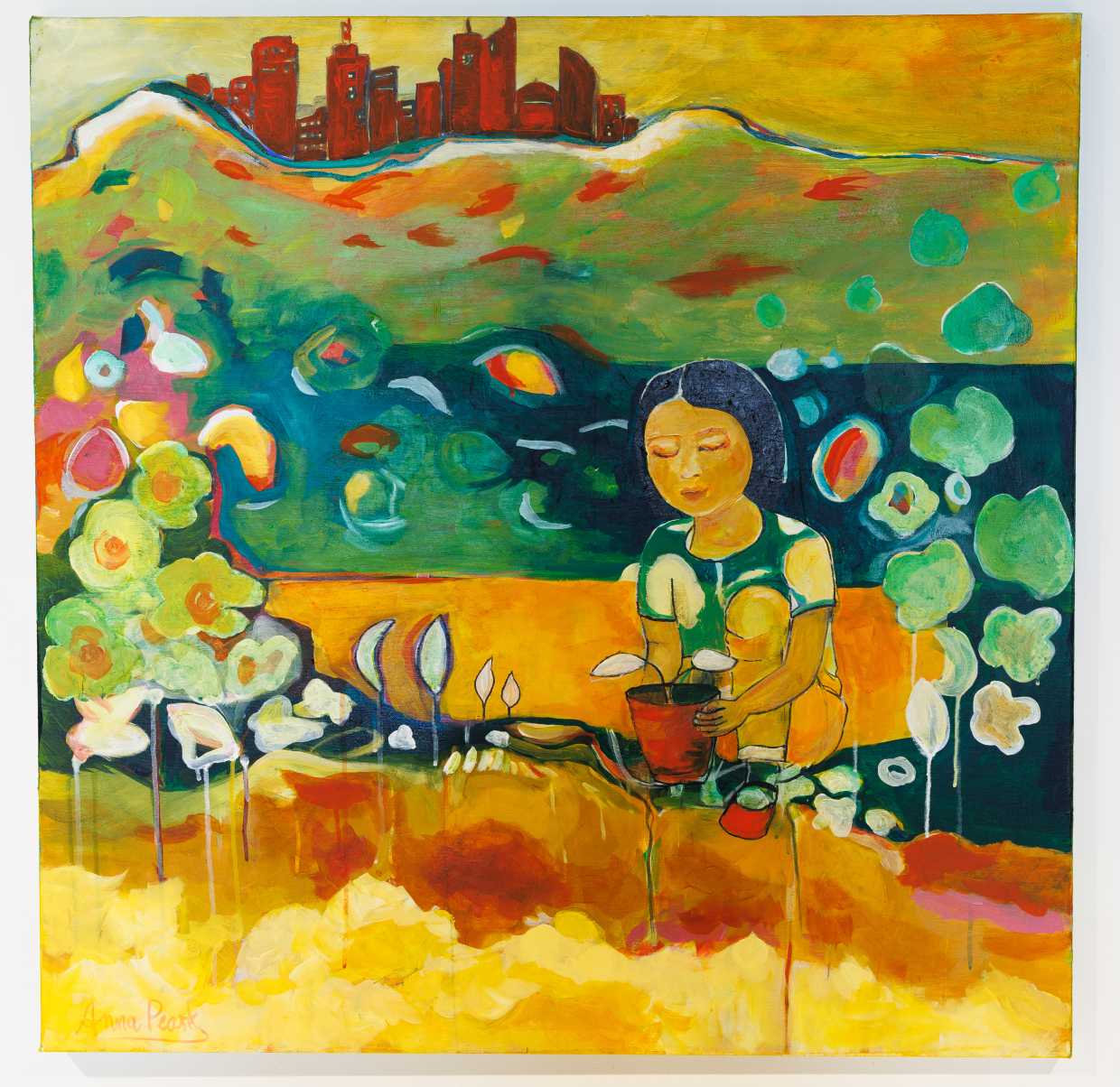 Note from the artist: As Melbourne gets hotter we need more vegetation to cool our suburbs. In my painting a child is planting the seeds of a future garden.