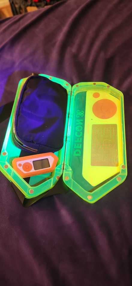 Here we are again, Year 5 of Puzzle's DEF CON Backpack auction! This year's backpack is a 13-inch acrylic hard-shell shoulder bag. This little bag will be perfect for all of your small hacker gear. Wide enough to fit an entire flipper, carry your chargers, cables, flash drives, and lock picks. Made from custom laser-cut UV reactive green Acrylic pieces this bag clam shells open and closed with embedded magnets. When open a small zipper bag conceals all of your gear from prying eyes. With an adjustable shoulder strap, sling it over your shoulder, wear it as a cross-body bag or if you are really daring, sport it fanny pack style! Be the talk of next year's DEF CON with this one-of-a-kind handmade bag. Keep people guessing, what's inside and enjoy the ability to be an absolute menace to society with the things you will keep locked inside of it. You must be at DEF CON 33 to be able to participate in the auction. I will hand deliver the backpack to you at the Conference in Las Vegas no later than Monday, August 11th 12 noon PDT. You will be contacted over your provided contact information and we will coordinate a meet-up in person. Payment will be taken at this time before the backpack is handed over to you.