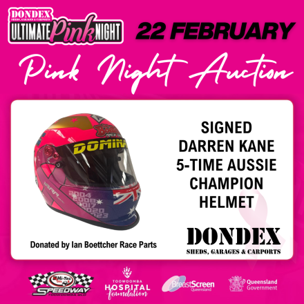 Specially produced Pink Night inspired Darren Kane Helmet celebrating his 5 Australian Super Sedan Titles. Helmet includes the years DK won Australian Titles, and comes with a big Aus 1 on the top and an image of the current car on the back of the helmet. Helmet will come signed by Darren Kane. Item must be collected from Toowoomba Speedway.