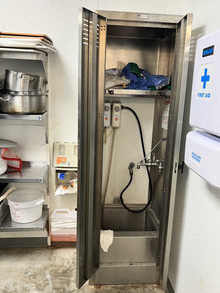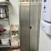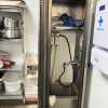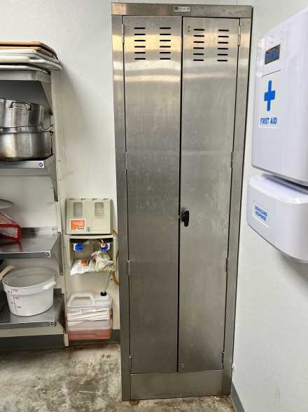 Janitor Cabinet, 25''W x 22-1/2''D x 84''H overall size, enclosed cabinet with open back for plumbing, (2) lockable louvered swing doors, includes: 20'' x 16'' x 12'' deep mop sink with drain, overhead shelf, rear-mounted mop holder with (2) locking cams