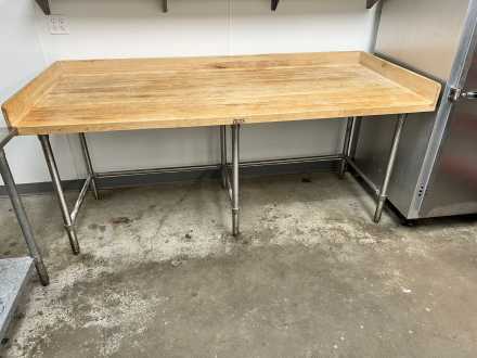 Work Table, baker's top, 84''W x 36''D x 39-1/4''H overall size, 1-3/4'' thick top with 4'' coved riser on back & both ends, Northern Hard Rock Maple, stainless steel legs, side & rear adjustable bracing, bullet feet, NSF, KD