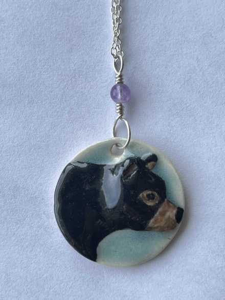 Stephanie Bergman was an artist as a child, became a scientist in adulthood and now is become an artist again. Stephanie Bergman is a west coast storyteller in clay. Melding a scientist’s curiosity, an artist’s creativity, and an adventurer’s experiences into handmade pieces that let us wear, hold, and treasure the vibrant essence of oceanic wildlife. This necklace is on a 20" silver plated chain featuring a bear ceramic with sterling silver wire wrap and an amethyst stone.