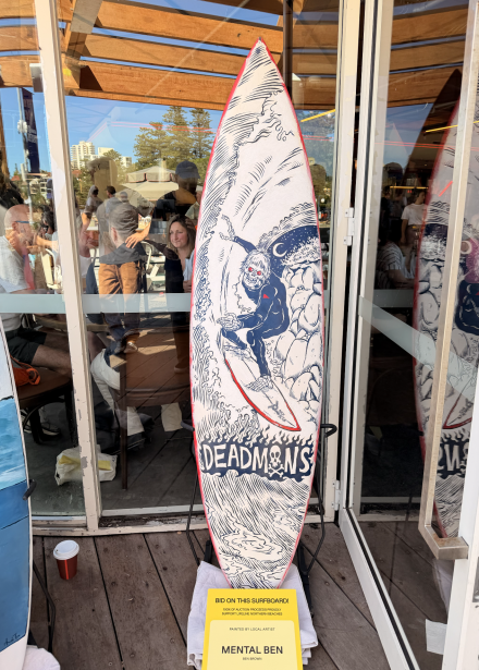 Bid on a one-of-a-kind hand-painted surfboard by legendary Northern Beaches artist Ben Brown. A bold tribute to Manly’s notorious surf break, Deadman’s -- auctioned in support of Lifeline.