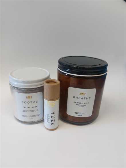 Indulge in simple, soothing self-care with this beautifully curated gift bag from the Kodo Collection. This set includes a Soothe Facial Mask, a Vanilla Mint Mineral Bath Soak, and a Yuzu Lip Balm.