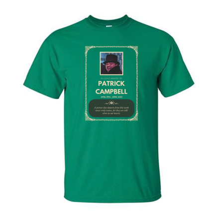 Alright, folks stop scrolling, because you’re about to witness fashion and philanthropy history. Up for auction is this truly sensational, lovingly commemorative, astonishingly green T-shirt dedicated to the legendary Patrick Campbell, known to the police as Patters.