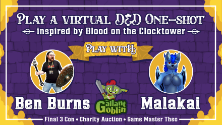 Join Theo from The Gallant Goblin for an exclusive, one-night-only Dungeons & Dragons adventure set in the chaotic, kobold town of Goblinshire! This virtual one-shot, played on Zoom and Roll20, will find you teamed up with Clocktower personalities Malakai and Ben Burns for a night of mystery, mayhem, and kobold-fueled shenanigans. Bid for your seat at the table and experience a Blood on the Clocktower-inspired adventure filled with intrigue, social deduction, and high-stakes heroics. The game will take place in summer 2025, so sharpen your wits and get ready for an unforgettable night of storytelling and mystery—all for a great cause!
