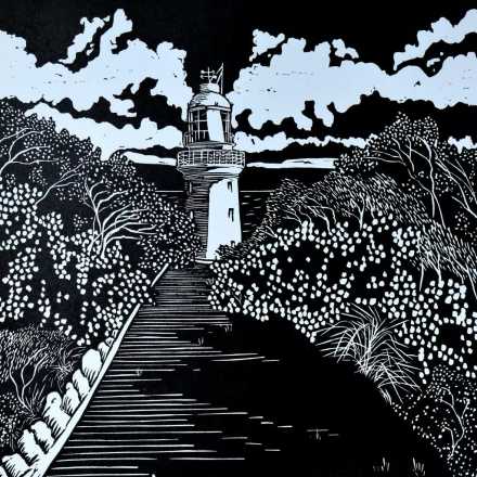‘Memories of Maatsuyker’ is one of several pieces inspired by Di’s experiences living on Maatsuyker and first exhibited at the Handmark Gallery in 2019. She brings to life the island’s wind-swept isolation through her strikingly raw hand-cut prints.