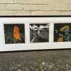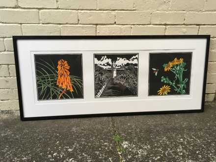 Medium: Hand-coloured linocut prints on paper, professionally framed.