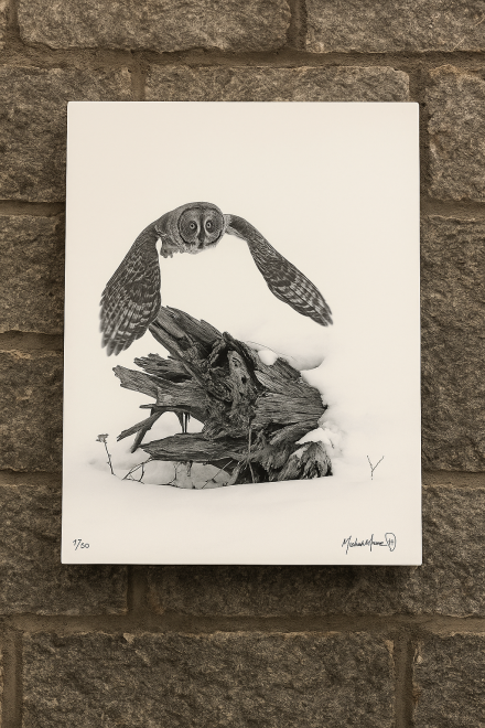 Experience the striking beauty of nature with this black-and-white framed photograph by local Augusta photographer Mike Watts. Known for his breathtaking wildlife photography, Mike captures the power and grace of this majestic owl in mid-flight with extraordinary detail and artistry.