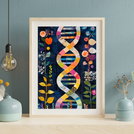 Description: “DNA Double Helix” is a vibrant celebration of biology and beauty—where the structure of life is intertwined with plants, flowers, and color. This piece reimagines the double helix as something living and joyful, a ladder not just of nucleotides, but of blossoms and growth. It’s where science and nature merge into one elegant pattern.