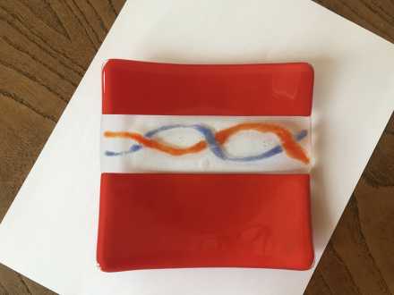 Description: This 6” x 6” glass plate was made by using 96 COA orange and clear glass to create a double helix strand via two colors of fine fruit glass. The pieces were first fused with a second firing to create the shape.