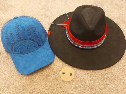 Description: This leather hats combo is custom ordered and then burned by My Six Designs. The earrings are genuine gemstones. Multiple way to dress up as desired!