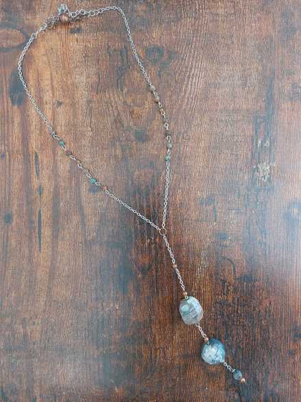 Description: Add a touch of rustic elegance to your jewelry collection with this unique handcrafted necklace. Featuring a delicate silver-toned chain interspersed with small, earthy-toned beads, the piece transitions into a striking Y-drop design. Two large, stones in soft shades of grey and blue serve as the focal point, accented with subtle copper-toned spacers and a dainty trio of coordinating beads at the tip. This necklace effortlessly blends natural elements with modern design, making it a versatile statement piece for both casual and formal wear.