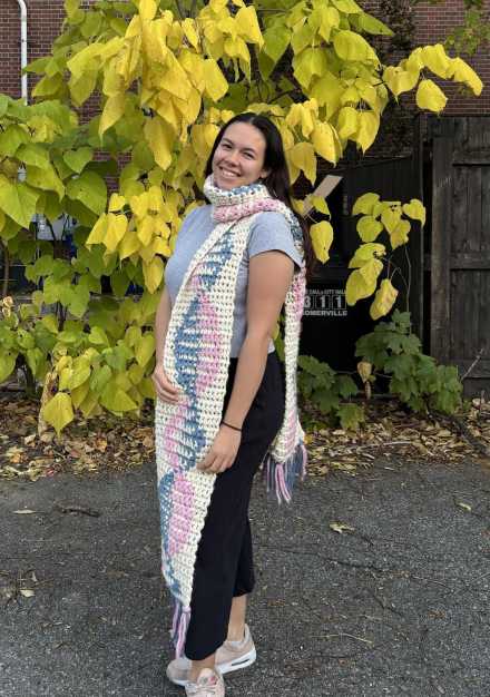 Description: Yarn is made from 80% Acrylic and 20% Wool. The scarf measures 6+ feet long and approx. 8 inch wide. Double Helix pattern is made using tapestry crochet technique. Pattern repurposed from "DNA bucket hat pattern" by TyBailie.