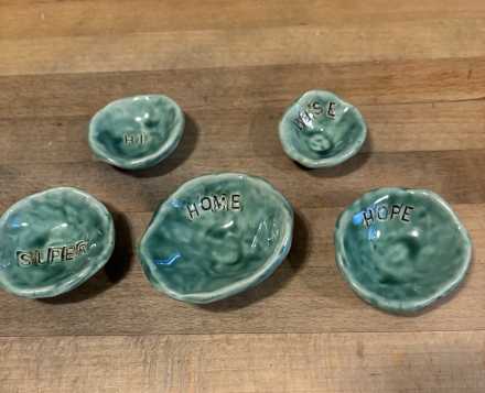 Description: Add a touch of charm and inspiration to your home with this set of five handmade ceramic dishes. Each uniquely shaped piece features a glossy turquoise glaze and a word. Perfect for holding jewelry, small trinkets, or simply as decorative reminders of positivity. A beautiful addition to any table, desk, or shelf — and a thoughtful gift that supports creativity and community