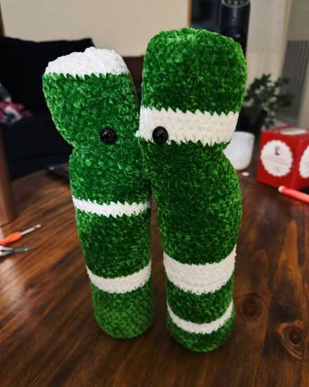 Description: This crocheted chromosome plushy is made out of chenille green and white yarn. Liza crocheted these gigantic (arm size) plushies as a thank you to her program faculty while she was in school. She is now donating this one to GSF for its work in getting people the genetic care they need!
