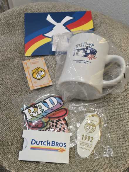 Description: Get your caffeine fix in true Dutch Bros style! This fun and colorful gift bundle includes a $25 Dutch Bros gift card - perfect for fueling up on your favorite drinks.
