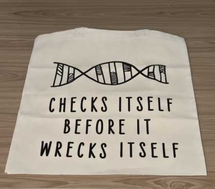 Description: Carry your essentials - and a touch of humor - with this stylish, science-themed tote bag! Featuring a clever DNA double helix design and the witty phrase “Checks itself before it wrecks itself,” this tote is perfect for students, teachers, researchers, or anyone who loves a good biology pun. It’s both functional and fun - because even your genes know the importance of self-care!