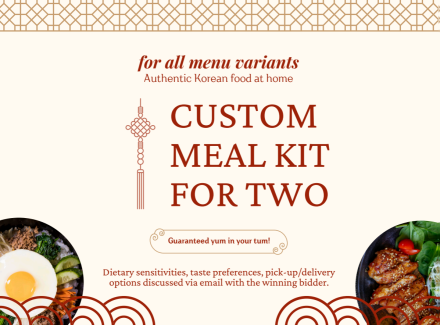 Bring the flavours of Korea into your own kitchen with a custom meal kit for two. Working with the provider, the winning bidder will get a customised choice of dishes to choose from. Dietary needs can be accommodated without compromising flavour or community love.
