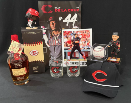 Calling all Reds faithful! This loaded Cincinnati Reds basket is a grand slam for any die-hard fan. Savor the exclusive Big Red Barrel Select "The Cycle" Maker’s Mark Private Selection Kentucky Straight Bourbon Whiskey, perfect for toasting epic game nights. Sip in style with two Reds-branded bourbon glasses. Cherish a Nick Lodolo signed baseball and a Spencer Steer signed photo, both authenticated treasures for your collection. Show off your fandom with an Elly De La Cruz Pop! vinyl figurine, a vibrant poster, and a classic Reds baseball hat. Ideal for displaying your Cincinnati pride at home or at Great American Ball Park, this basket is a home run for collectors and fans alike. Bid now to score this Reds legacy package and celebrate the heart of the Queen City!