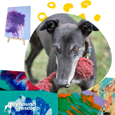 Greyhounds are invited to participate in creating artworks as a form of enrichment. Enrichment activities are excellent to help rescued hounds develop confidence and decision-making skills. Money raised from the sale of artworks assists with the high costs of rescuing, rehabilitation, and rehoming greyhounds.